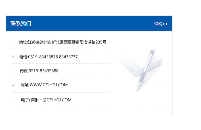 地址:常州市新北區友邦商務大廈1幢16、17層  電話:0519-85101652  傳真:0519-85112595  郵編:213022  網址:www.cz-jiayue_cn.xjnzsc.com  郵箱:xiajifengaa@163.com